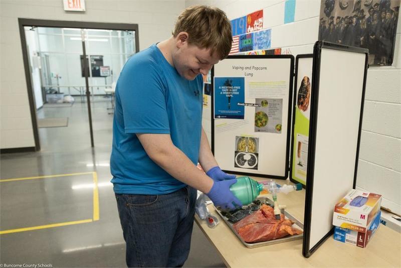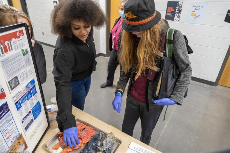 Buncombe County Schools board member for the Roberson district, Amy Churchill, visited Community High School with two special guests in tow - pig lungs! Ms. Churchill, a respiratory therapist for 32 years, visited the Substance Abuse Prevention fair to teach about the dangers of smoking and vaping. She presented students with a hands-on lesson about nicotine use by allowing them to inflate two different pig lungs - one exposed to cigarette smoke (equivalent to being a 10-year smoker) and one healthy set of lungs.